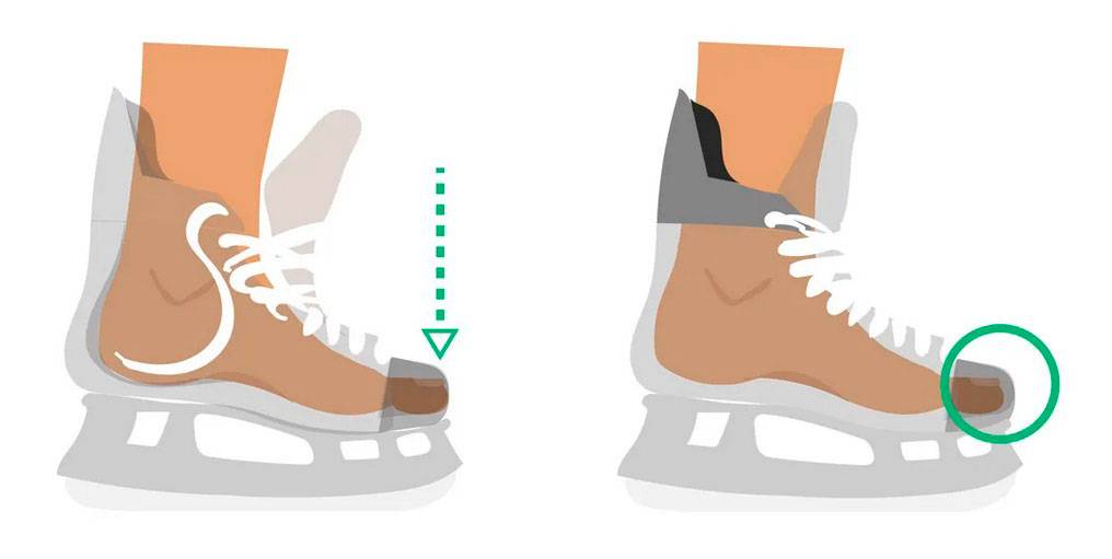 Когда вы опускаете ногу внутрь ботинка конька, пальцы должны едва касаться подноска, при условии что коньки не зашнурованы. Сначала может показаться, что коньки слишком маленькие, но помните, что когда вы полностью зашнуруете коньки и встанете, ваша пятка будет погружаться глубже в пяточном кармане, что отодвинет пальцы назад настолько, чтобы они могли больше не касаться внутренней части подноска.