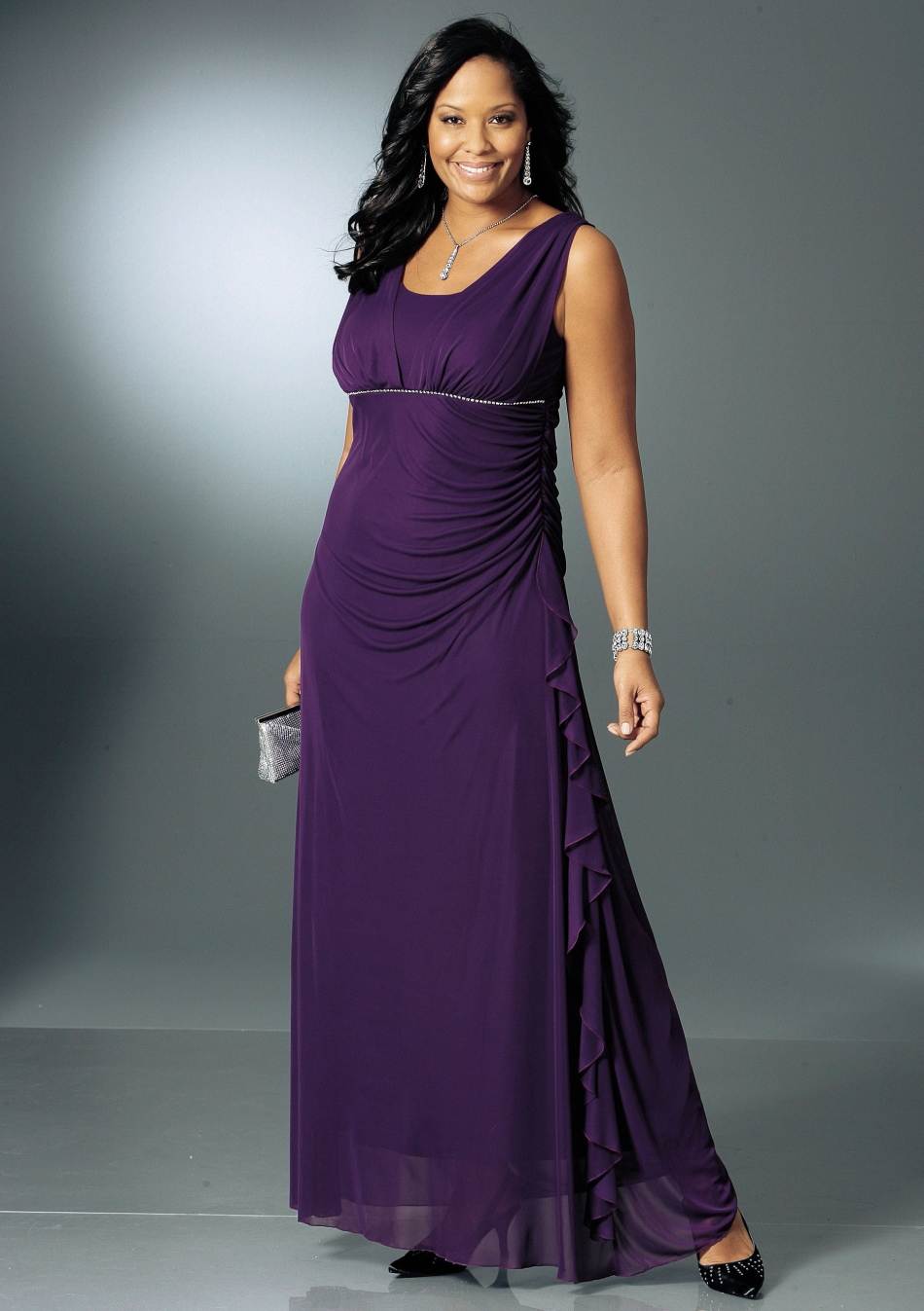 Хороший выбор для леди с такими пропорциями – туалет А-силуэта с юбкой в пол или за колено. В такой версии будут выгодно акцентированы главные изюминки фигуры. Вечерний образ в платье с расклешенным подолом и узким лифом, выполненном из струящегося материала, позволит мягко выделить соблазнительность бедер, ненавязчиво расширяясь внизу.