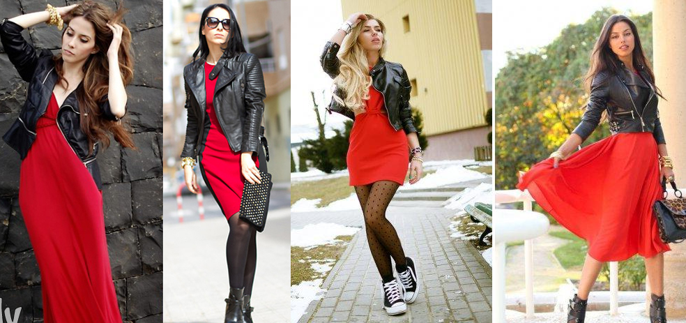 Уже не первый год в моде сочетания кожаных курток с романтическими легкими платьями любой длины — и в пол и мини. Такие наряды актуальны и теплой осенью, когда куртку можно носить расстегнутой, и в более холодные периоды, когда актуальны вязаные платья или деловые платья-футляры.