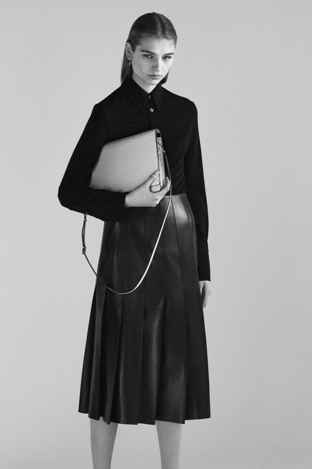 Длина миди универсальна и практична. Преимущество кожаной юбки ниже колена в том, что она легко и непринужденно вписывается практически в любой образ и отлично сидит на любой фигуре. Стильные юбки миди из кожи присутствуют во многих коллекциях осень-зима. Все они в основном со слегка завышенной талией, что зрительно вытягивает фигуру. Подобный фасон просто немыслим без обуви на каблуке. Юбка миди, облегающая силуэт, прекрасно сочетается с водолазками или блузками, заправленными во внутрь. Модные кожаные юбки 2020 года смотрите на фото с показов модных домов Alberta Ferretti, Derek Lam, Hermès.