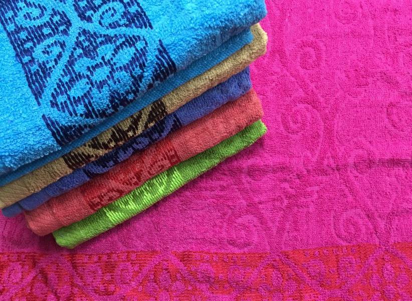 - Полотенца для пляжа – яркие махровые или велюровые полотенца размером 100х180 см. Они отличаются своей практичностью и износостойкостью. Отлично подходят для подстилания на песок или шезлонг.