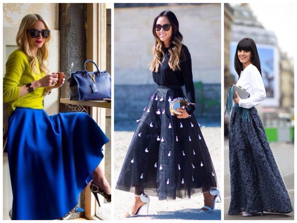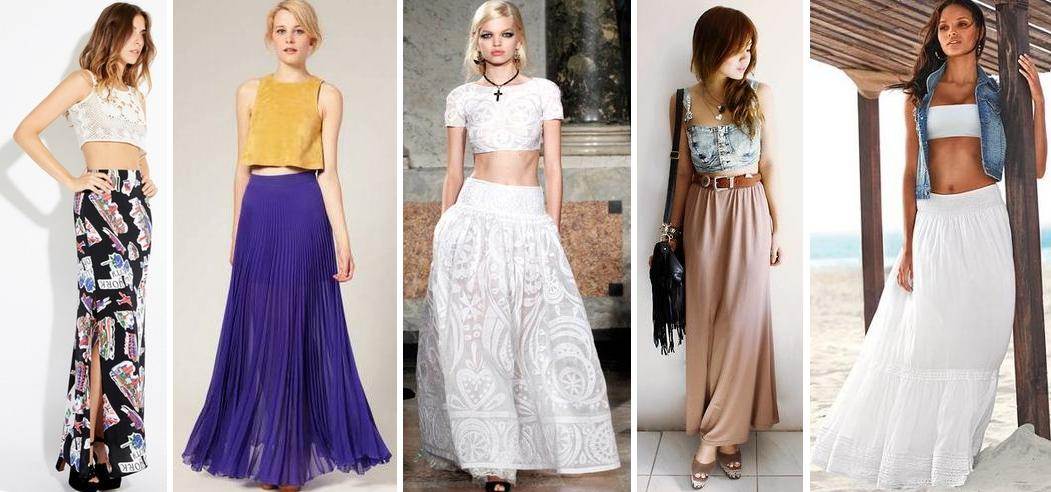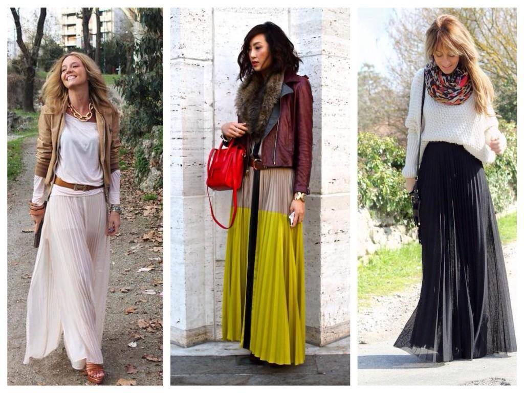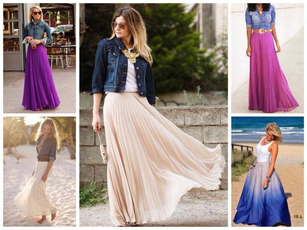 Самой популярной моделью среди длинных моделей является макси в складку или плиссировку. Ее лучше всего комбинировать с блузами без рукавов, лаконичными топами (приталенными или прямого кроя), жакетами из замши или кожи (укороченными, облегающими или более свободными), жилетами. Облегающие топы лучше заправить в юбку и подчеркнуть талию ремнем, свободные можно заправлять за пояс спереди, остальную часть оставив свободной. Среди юбок-макси популярны и модели среднего объема с небольшим количеством складок.