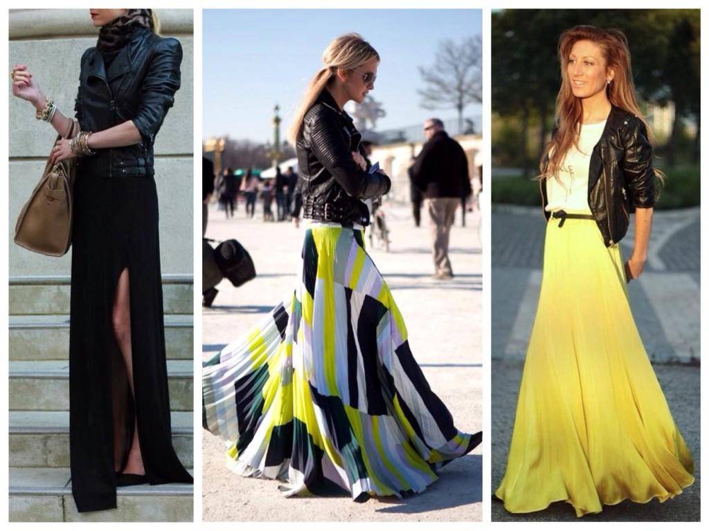- отдельно хотелось бы выделить короткие кожаные куртки, которые будто бы созданы для ношения их с длинными прямыми или в сборку юбками. Аналогично будут сочетаться и джинсовые куртки с трикотажными однотонными прямыми юбками макси. Подойдет такой вариант практически каждой женщине;