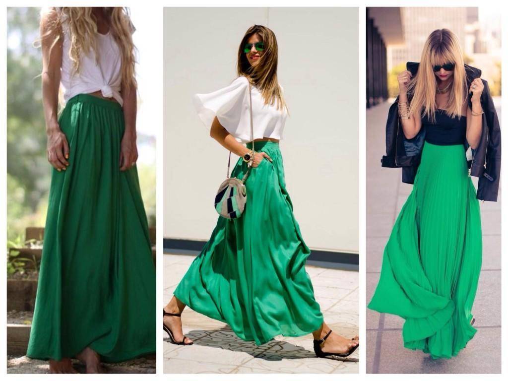 Хороши сочетания из ярких однотонных элементов одежды – зеленой юбки в пол и бордовой или желтой майки, оранжевого низа и синего верха. Такой образ следует дополнить стильными аксессуарами – шляпкой и поясом. Летом с вариантом макси всегда можно надеть классическую белую майку.