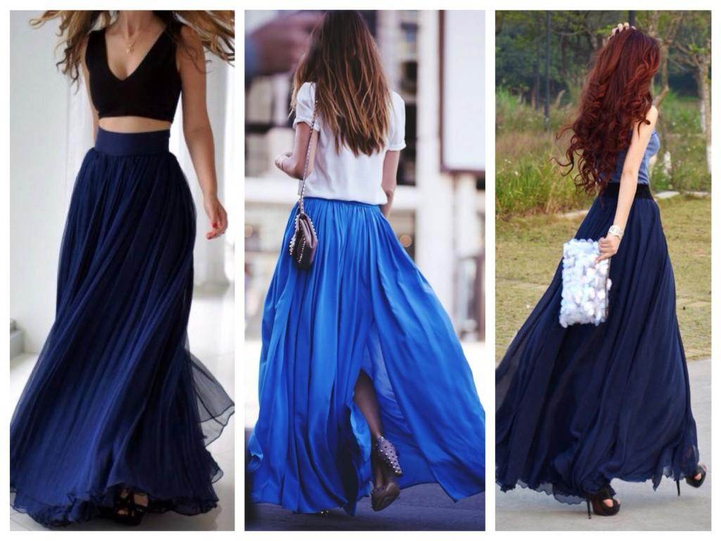Синие юбки макси – обладают неким притягивающим свойством. Сам по себе синий цвет является благородным. Он успокаивает и дарит умиротворение. В такой юбке вы точно не останетесь не замеченной.