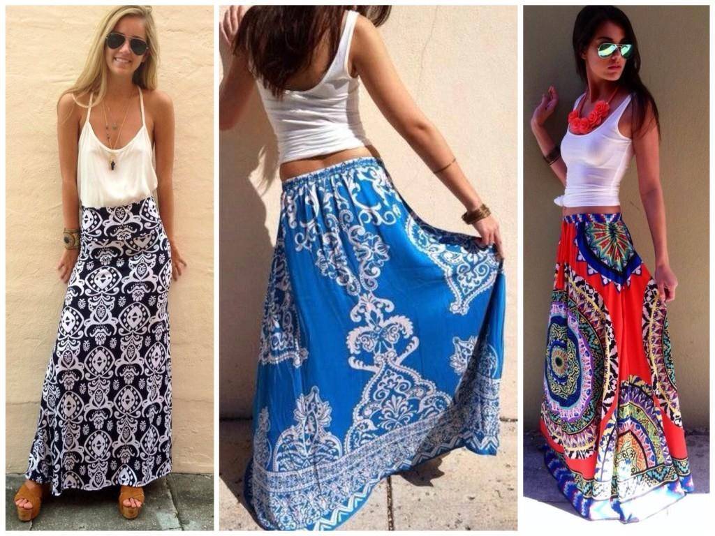 Лето позволяет разбавить гардероб яркими красками. Длинную цветастую модель солнце лучше дополнить однотонным топом и наоборот. Расцветка для верха не должна быть слишком скучной – синяя юбка отлично будет смотреться с белой футболкой, а с бежевой – уже не так эффектно.