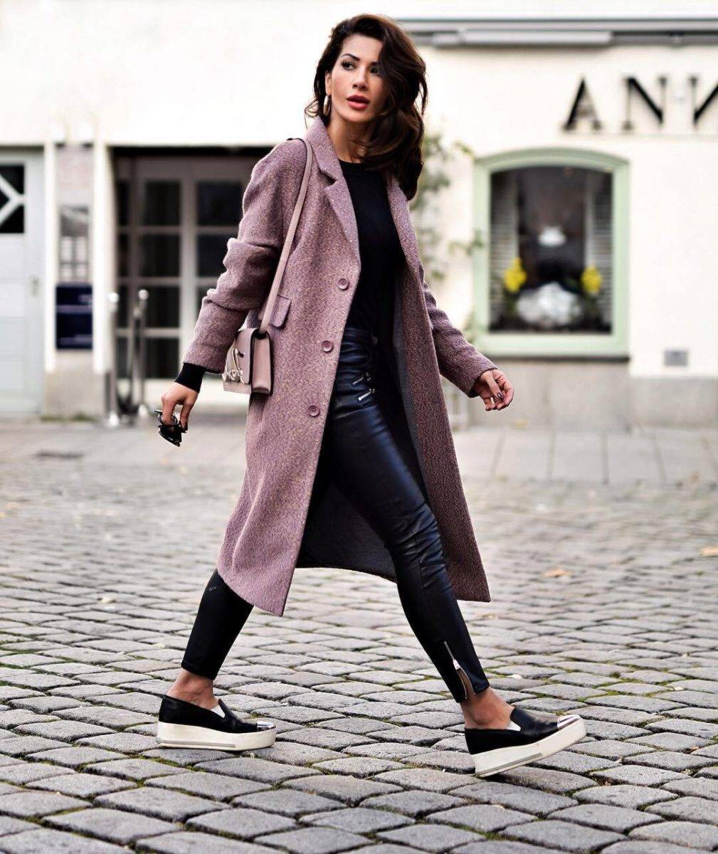 В грядущем сезоне чрезвычайно модно сочетание пальто с кроссовками. Эта комбинация актуальна осенью. В холодную погоду выбирайте утепленные сникерсы на толстой подошве.
