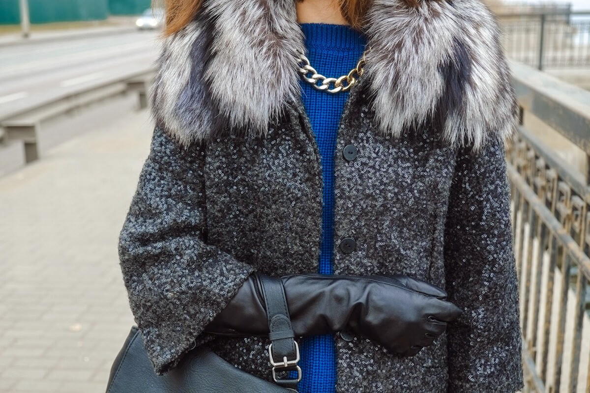 Изящное голубое пальто с большим воротником и меховой отделкой достойно королевских особ. Высокие сапоги и яркий шарф доведут образ до совершенства. А тонкий пояс подчеркнет точеную талию.