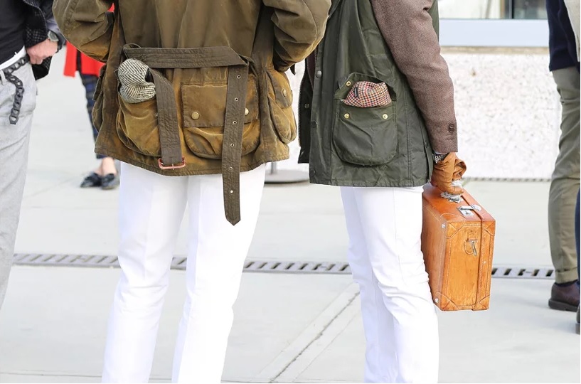 Вощеные хлопчатобумажные куртки, которые на этих джентльменах, выглядят лучше, потому что они немного потрескались по краям. И вот, есть красивый кожаный портфель, который держит мужчина справа. Этот портфель с видимыми вмятинами и потертостями многих лет от регулярного использования. Мы можем только подождать некоторое время, чтобы получить такой же результат. Еще один момент, который иллюстрируется здесь, состоит в том, что, хотя некоторые предметы становятся лучше с возрастом, другие – белые джинсы, например, не следуют такому правилу. Держи их в чистоте.