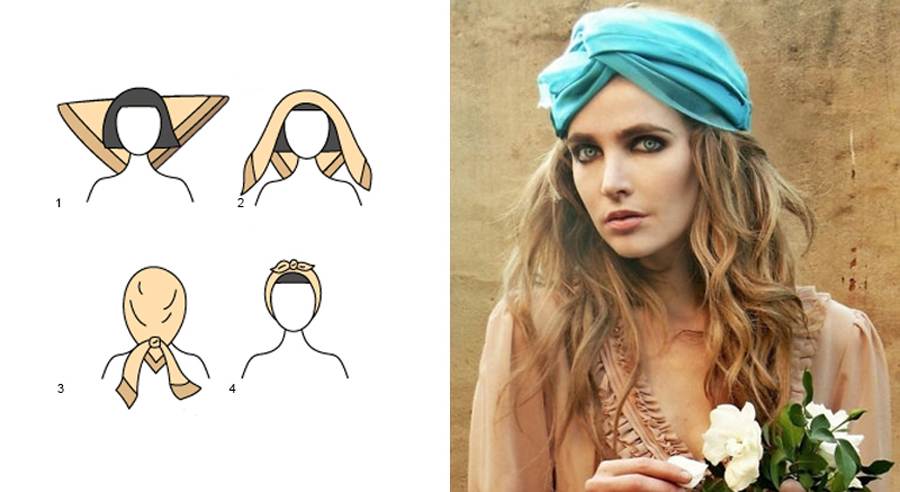 . Для этого просто сложите косынку несколько раз в длину и уложите на волосы возле лба. Свободные концы несколько раз проведите через голову и затяните плотным узлом на затылке. В зависимости от образа, узел может располагаться сбоку или спереди головы. Но в таком случае, торчащие уголки лучше спрятать под ткань, чтобы они были незаметными.