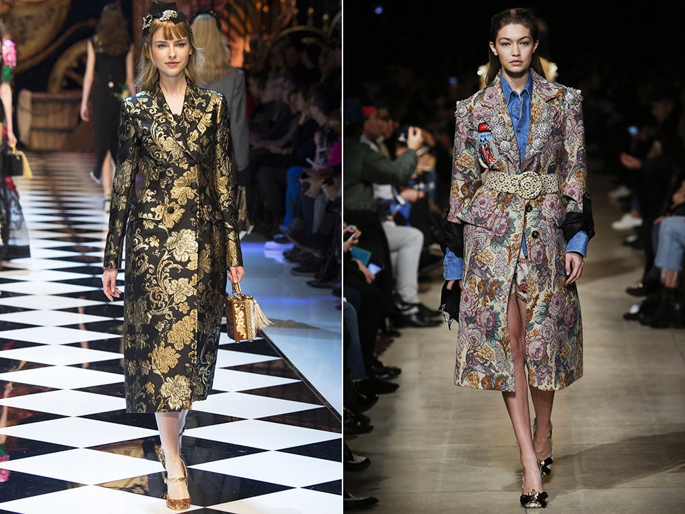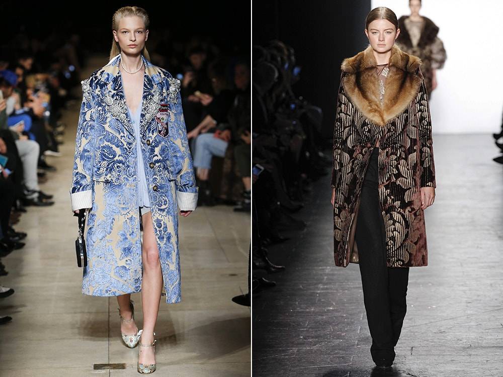 Цветочный принт приобретает новый облик в виде мебельных вензелей и узоров. Пальто в подобном дизайне, как правило, шьют из дорогих материалов – гобелена, жаккарда с насыщенными красками, благодаря чему достаточно простой фасон будет выглядеть роскошно.