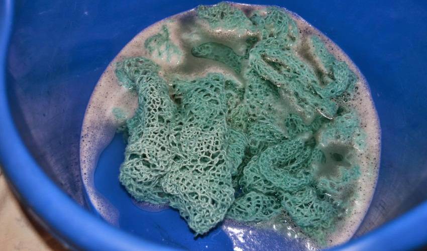 - Доставать из таза платок нужно, предварительно скомкав в шар и отжав воду. Потом положить в сетчатый мешочек и повесить над раковиной.