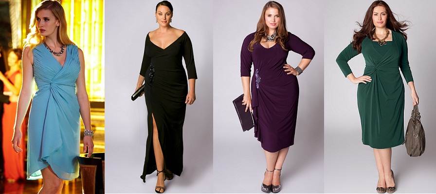 Такой фасон подойдет не только хрупким девушкам, но и корпулентным дамам. Драпировка этого наряда, вертикальные и диагональные линии, а также V-образный вырез, подчеркивающий декольте, представит фигуру в лучшем свете.