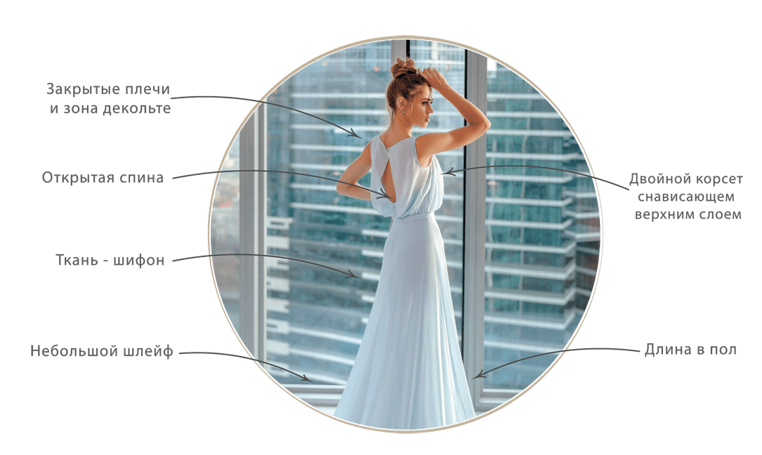 Если нужно скрыть недостатки фигуры, полноту, подойдет фасон ампир. Драпировка в области груди с длинной юбкой нежного оттенка прекрасно гармонируют с торжеством.