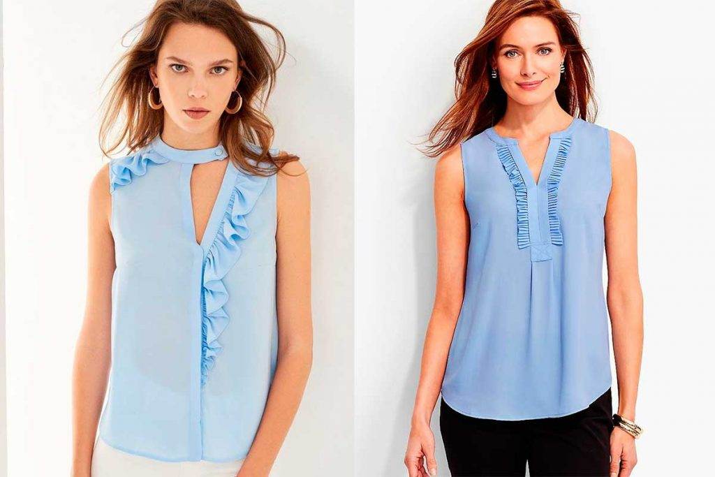 - Откажитесь от блуз, платьев, кофт и т.д., с декоративными элементами, к примеру, рюшами, драпировкой, жабо и т.д.