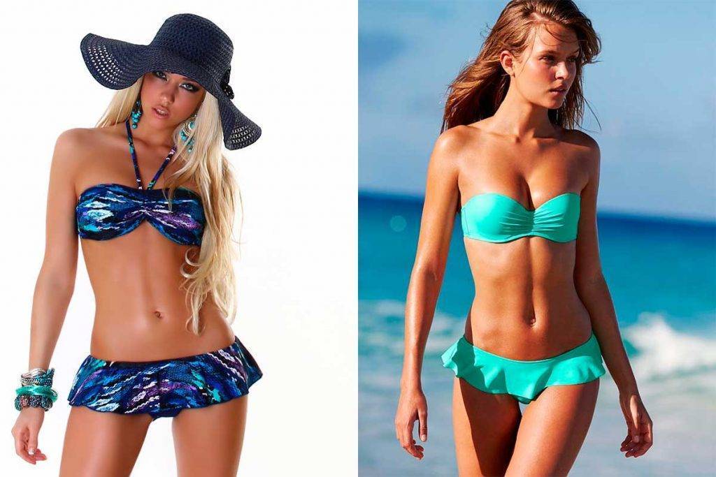 Проще всего замаскировать отсутствие талии при помощи раздельного яркого купальника. Равномерно расширить верх и низ помогут лиф-бандо и плавки с низкой посадкой. Попробуйте примерить максимально открытый сдельный купальник, состоящий из лифа и плавок, соединенных вертикальной полоской ткани. Такая модель вытянет силуэт и сузит область талии.