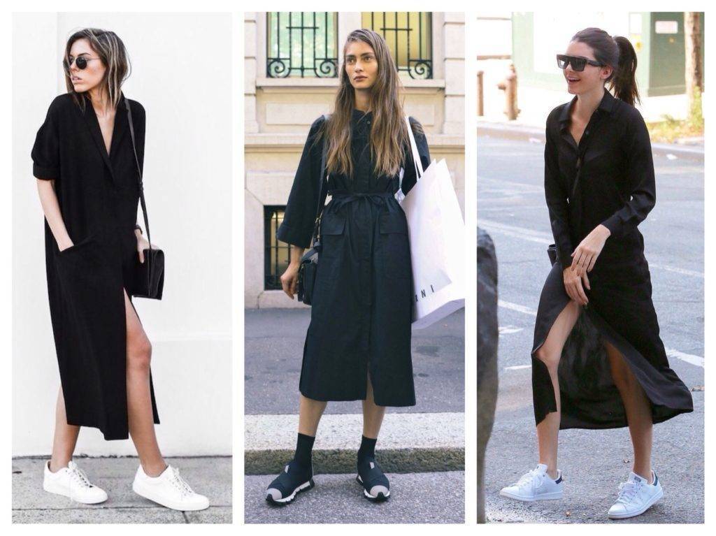 Черные кроссовки с платьем — еще один часто встречающийся образ, особенно в повседневном стиле одежды.
