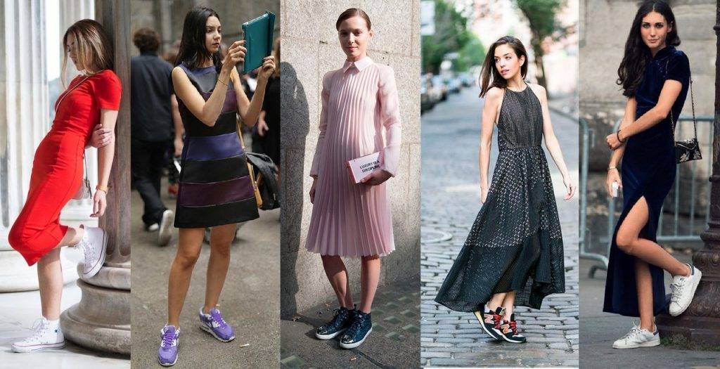 Соблюдая ряд правил, вы сможете скомбинировать с кроссовками не только спортивные платья, но даже деловые или вечерние модели.