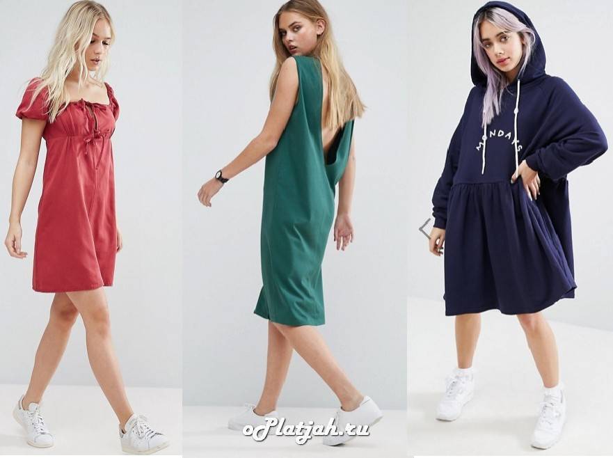 Платья-поло, туники, платья-футболки, наряд в стиле сафари, в форме длинной майки прекрасно сочетаются с кроссовками любой формы и цвета, в том числе с ugly sneakers