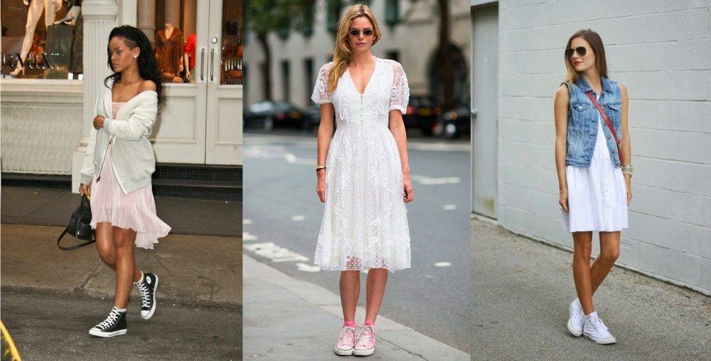 Если вы не можете определиться, какое надеть платье под белые кеды, учитывайте окружающую обстановку и предстоящее мероприятие. Выбирайте модель спортивной обуви, которая будет гармонировать с фасоном платья. Чтобы не ошибиться с созданием комплекта, используйте уже готовые варианты: