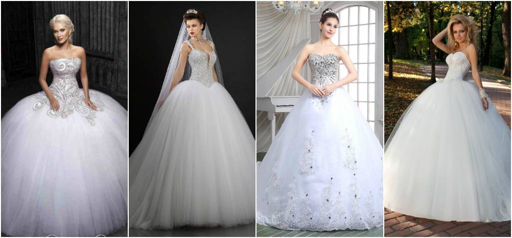 Данный фасон аналогичен предыдущему варианту, его отличие разве что в экстремальном объеме и пышности юбки. Такое платье не так часто встречается в салонах, да и пожелает его не каждая невеста, как минимум из-за некоторых неудобств, например, довольно тяжело сеть в машину или сходить в туалет.