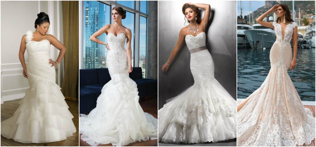 Свадебное платье фасона Русалка шьют по фигуре, оно повторяет каждую линию тела, юбка расширяется от колена. Часто такой тип платья украшают шлейфом. Это один из наиболее эффектных и соблазнительных фасонов. Поэтому многие девушки, просматривая фото различных моделей свадебных платьев в модных журналах, влюбляются именно в «русалку».