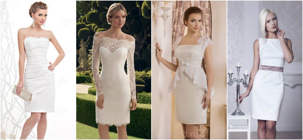 Если планируется скромная роспись без пышного торжества, то стоит присмотреться к варианту платья футляра. Оно может быть одновременно нарядным, удобным, практичным, и уж точно пригодится и после свадьбы. Такой наряд представляет из себя платье по фигуре длинной от мини до миди.