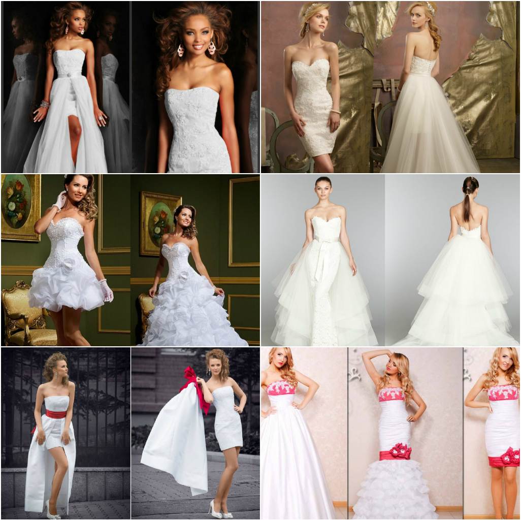 Для тех кто не может остановить свой выбор на чем-то одном в этом многообразии нарядов есть отличный вариант — два или даже три образа в одном платье. Суть фасона заключается в том, что юбка (или ее часть) имеет специальные застежки и легко снимается, превращая, например, пышную модель в футляр, или русалочку в прямое платье.