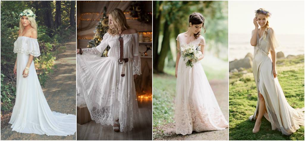 Основная концепция моделей в близости к естественному, природному — натуральные ткани, свободный крой, деревянные аксессуары. А благодаря широкой вариативности моделей, платье в данном стиле можно подобрать для любой фигуры.
