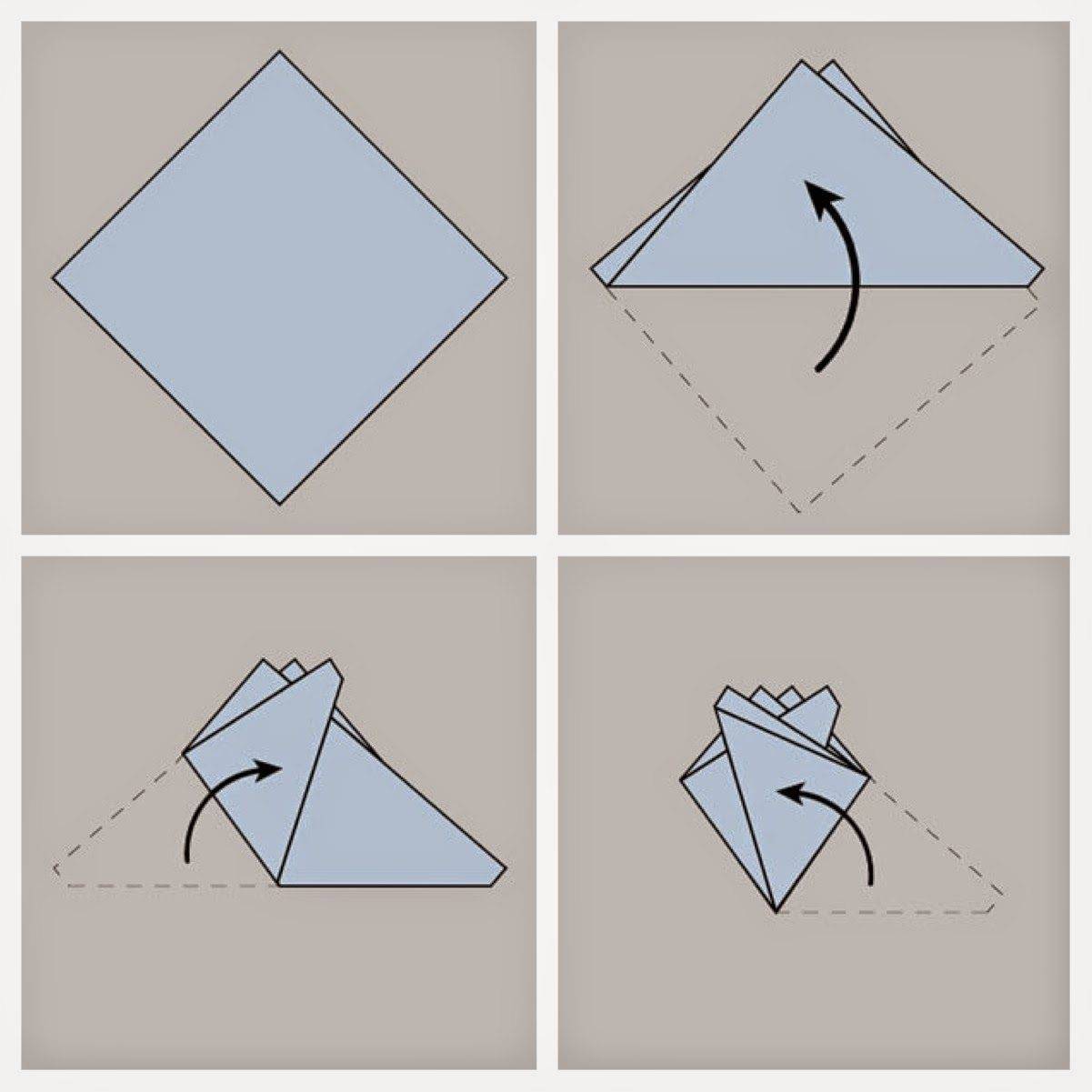 - Левый нижний уголок подгибается на правую сторону, правый нижний угол загибается влево.