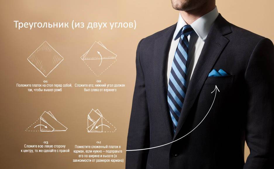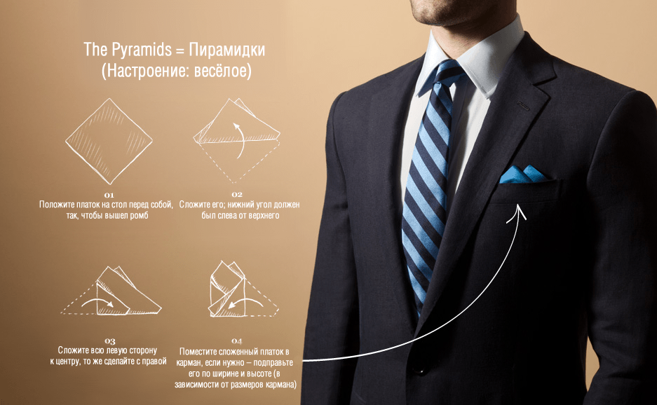 Его нужно сложить сначала пополам, а затем вчетверо. После этого платок надо положить в карман так, чтобы свободные концы были вверху с правой стороны.