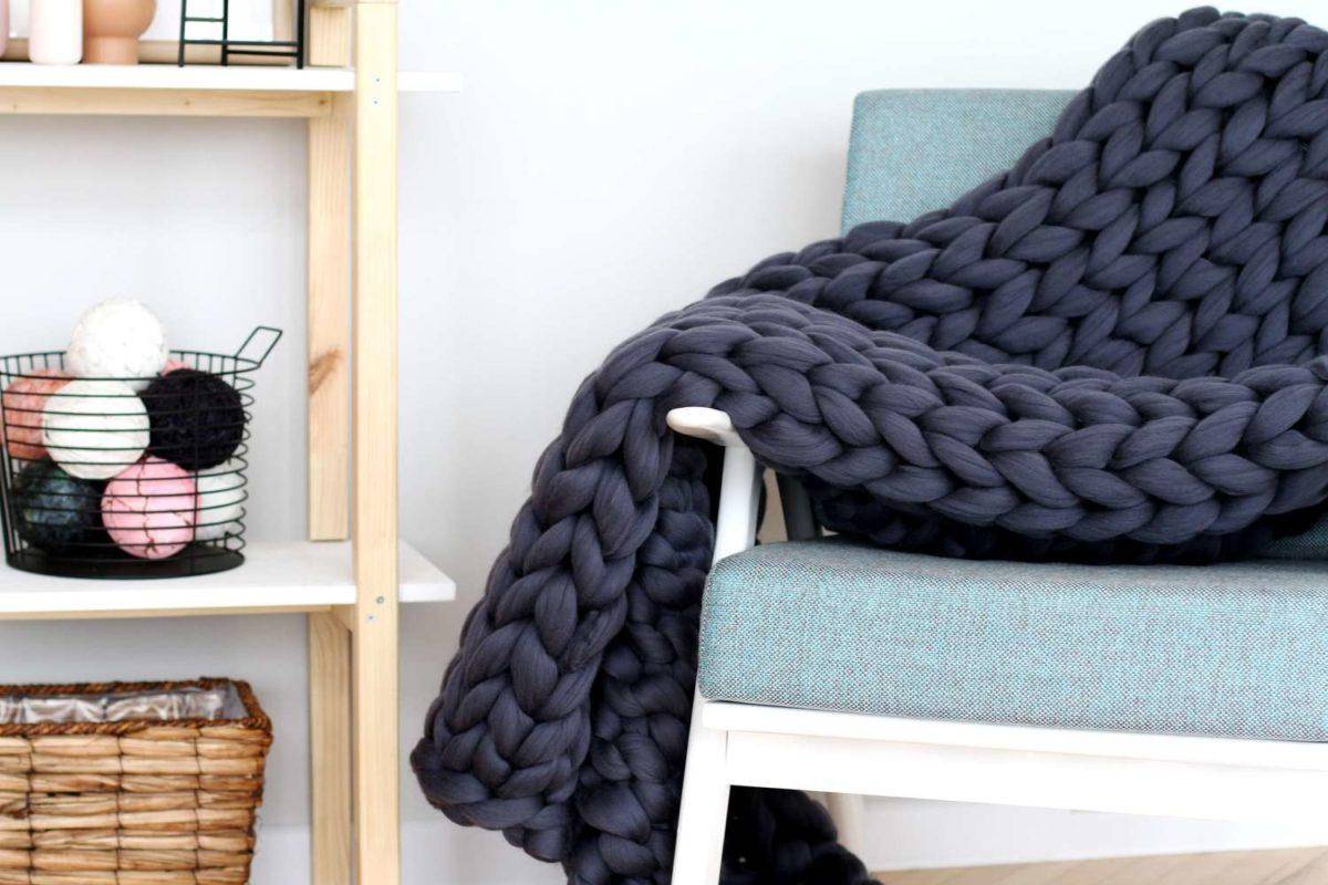 Пледы из толстой пряжи получаются довольно тяжелые, порой достигая веса более трех килограммов. Такие чаще выбирают как декоративные элементы интерьера: покрывала, чехлы и коврики. Достаточная толщина готового изделия позволяет стелить плед на пол.