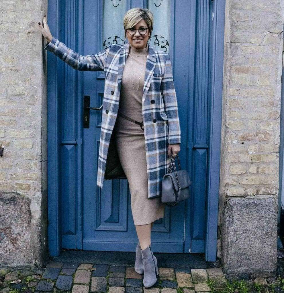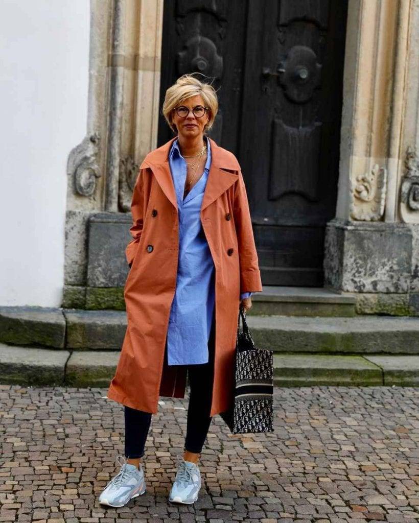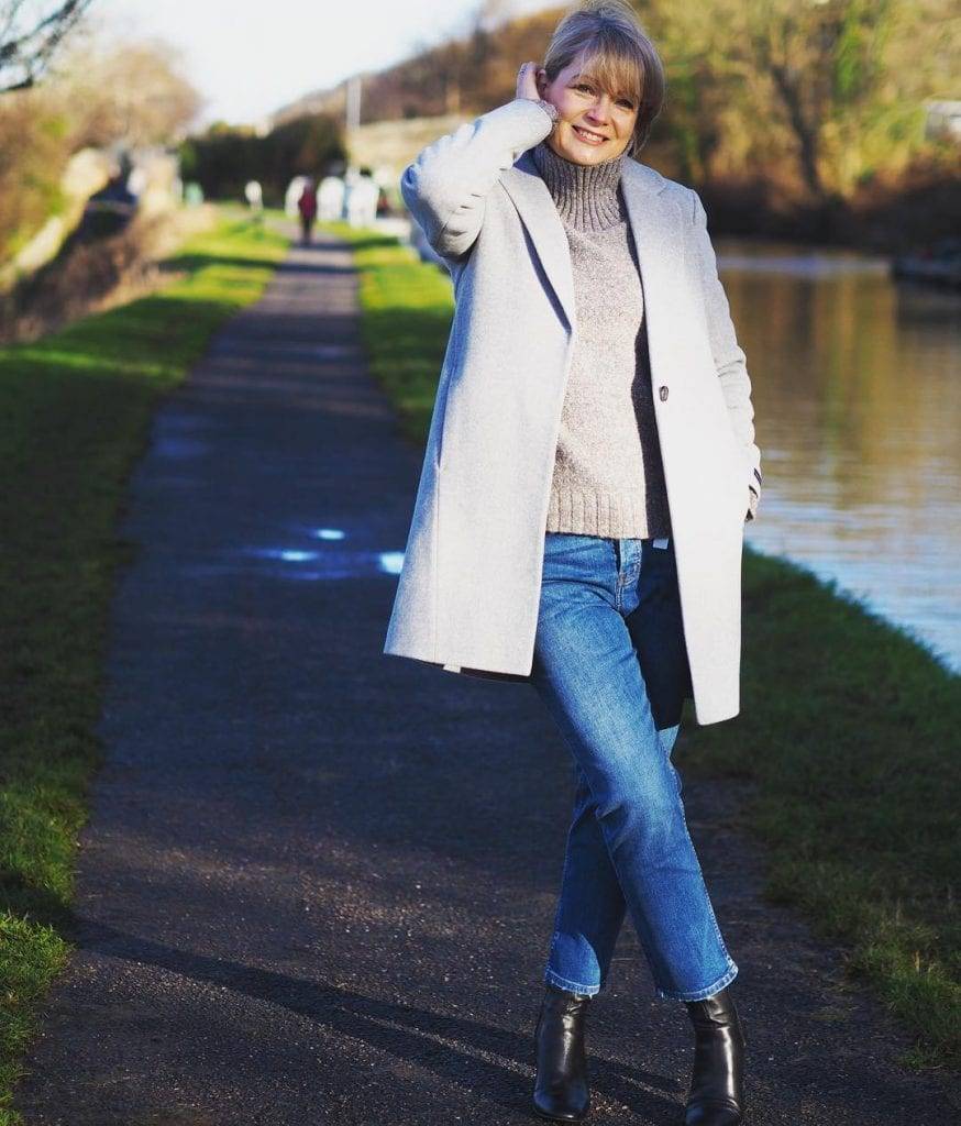 С джинсами. 50-летние женщины могут носить джинсы в комбинации с абсолютно любой моделью пальто. Но особенно интересно они будут смотреться с фасоном оверсайз. Нижняя часть лука должна иметь прямой или клёшеный от бедра крой. Что до обуви, это могут быть варианты на каблуке или танкетке, так и практичные лоферы, ботинки и мокасины.