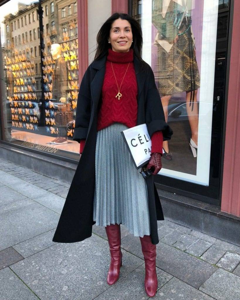 С юбкой. Сочетать с юбкой следует укороченное полупальто или же фасоны миди, которые по длине будут полностью закрывать нижнюю часть лука. Обувь в данном случае должна быть на небольшом устойчивом каблуке. Гармоничнее всего сюда впишутся туфли, полусапожки или же высокие сапоги.