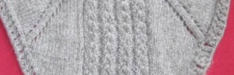Узор для вязания манишки на 4-х спицах с регланом можно выбрать любой. Интереснее всего будет смотреться изделие с косами на передней и задней частях работы и лицевая гладь на плечах.