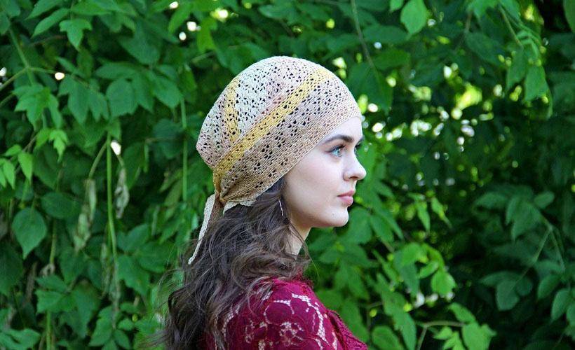 Изначально аксессуару придается форма треугольника. Полученную при этом конструкцию накидывают на голову и скрещивают краешки в передней части. Правый хвостик должен получиться немного короче, чем левый. Короткий конец скручивается жгутом, а затем заводится под подбородок.
