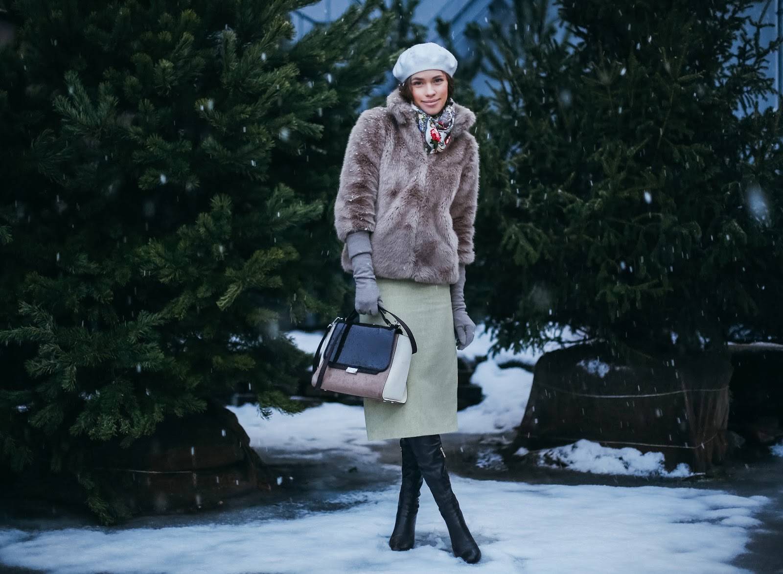Шубка до середины бедра отлично сочетается с юбкой длины миди. Близкая палитра, почти монохром, создают вертикаль и зрительно вытягивают силуэт. Вместо голых ног и туфель могут быть высокие сапоги или ботильоны + плотные темные колготки.
