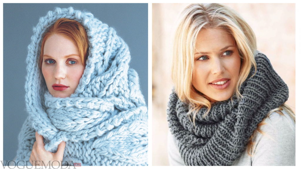 - Разнообразие фасонов, цветов и материй позволяет подобрать модель под собственный стиль. Узкая труба смотрится сдержанно, длинный хомут, обмотанный в несколько колец — ультрамодный тренд, а к тому же — очень тепло и уютно.