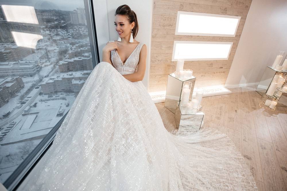 Аксессуары к блестящему свадебному платью нужно подбирать с особой осторожностью, так как существует риск переборщить с количеством мерцающих элементов в образе. Завершающим штрихом может служить свадебная фата со стразами