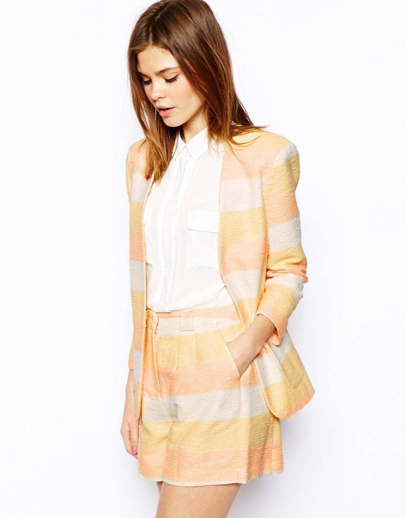 В тренде шорты на высокой посадке, клетчатые принты и блестящие материалы. Актуально и модно смотрятся жакет и шорты одной длины, луки в военном стиле. С шортами разной длины эффектно выглядят пиджачки-смокинги с воротником-шалькой из атласа, жакеты приталенные и с пелериной, длинные оверсайзы.