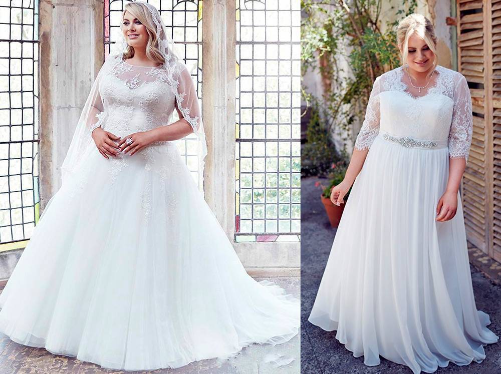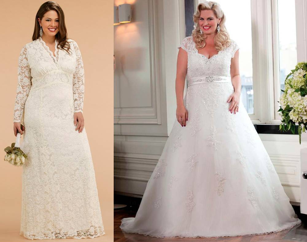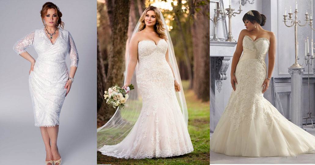 Невестам с пышными формами лучше всего подойдут матовые материалы, как плотные, так и струящиеся – шифон, креп, кружево среднего размера.