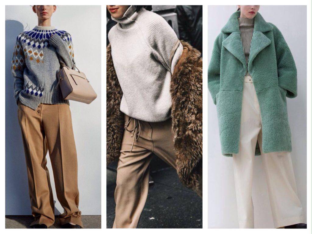 Идеи с чем носить зимой вязаные женские брюки, показаны на фото:
