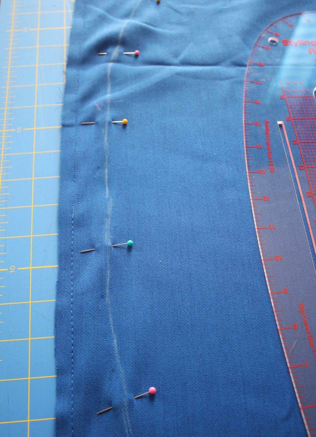 Бок передней детали обрабатываем оверлоком, подворачиваем припуск – 4 см – на шлицу, приметываем.