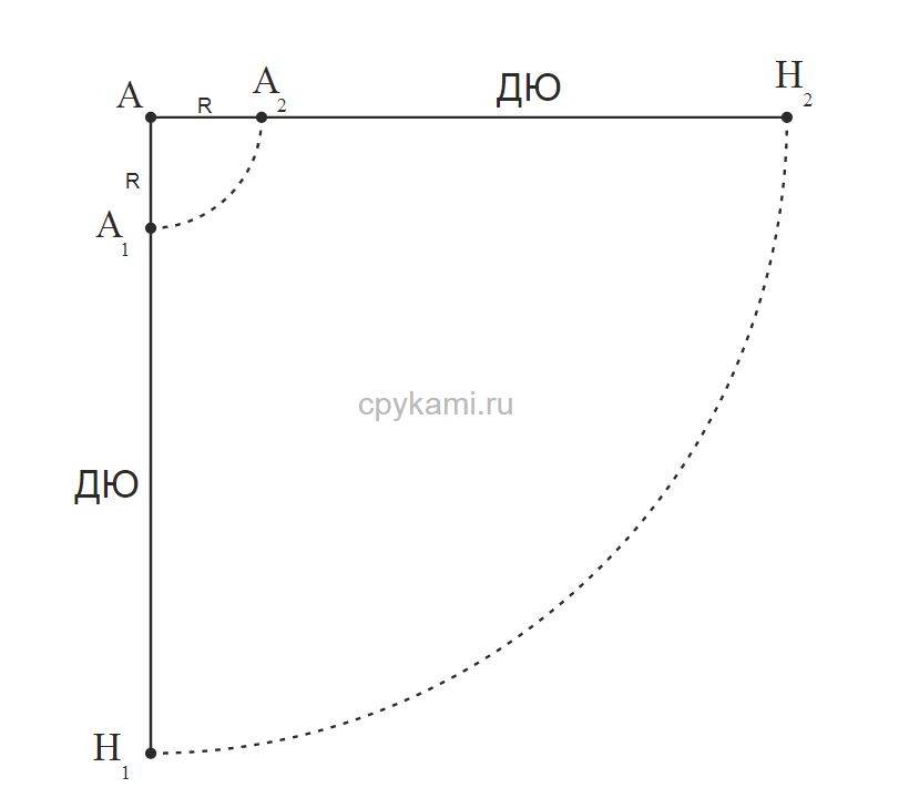 Следующая мерка — длина самой юбки (ДЮ). Откладываем отрезки А1Н1 и А2Н2 на сторонах угла. Затем строим новую окружность. Ее радиус лучше откладывать от точки А (ведь неточности при построении первой окружности отразятся и на нижнем крае). Радиус этой окружности будет равняться сумме отрезков АА1 и А1Н1.