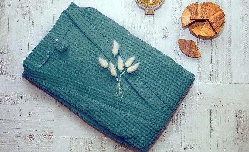 Вафельная ткань — полотно из хлопка, которое отличается объемным рисунком в клетку и напоминает одноименное кондитерского изделие. Такая ткань быстро впитывает влагу и сохнет. Несмотря на особую фактуру, она мягкая и приятная к телу. Вафельный халат — удачный вариант для посещения бани, сауны, бассейна или SPA. Такая модель прекрасно подходит для теплого времени года и является хорошей альтернативой тонким махровым моделям. Главными особенностями халатов из вафельной ткани являются: