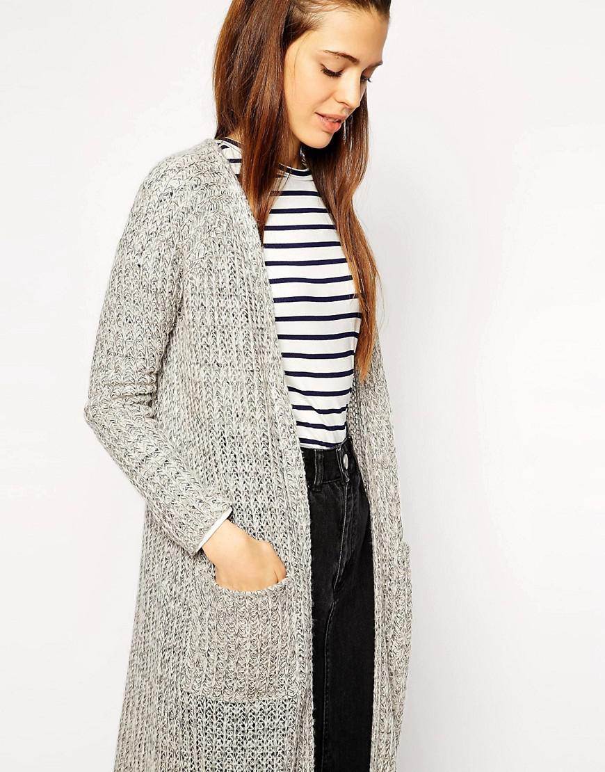 Стильные образы с кардиганом удлиненного фасона демонстрировали еще американские студенты, сочетая вещь с лоферами и слаксами, а сегодня с такими вязаными изделиями создают луки топовые стилисты. Для сета на каждый день просто соедините выбранную вещь с облегающими джинсами, любимой кофтой и обувью на низком ходу. Конечно, каблук также может присутствовать в созданной комбинации. Если на улице прохладно, объемный шарф не будет лишним в созданном ансамбле.