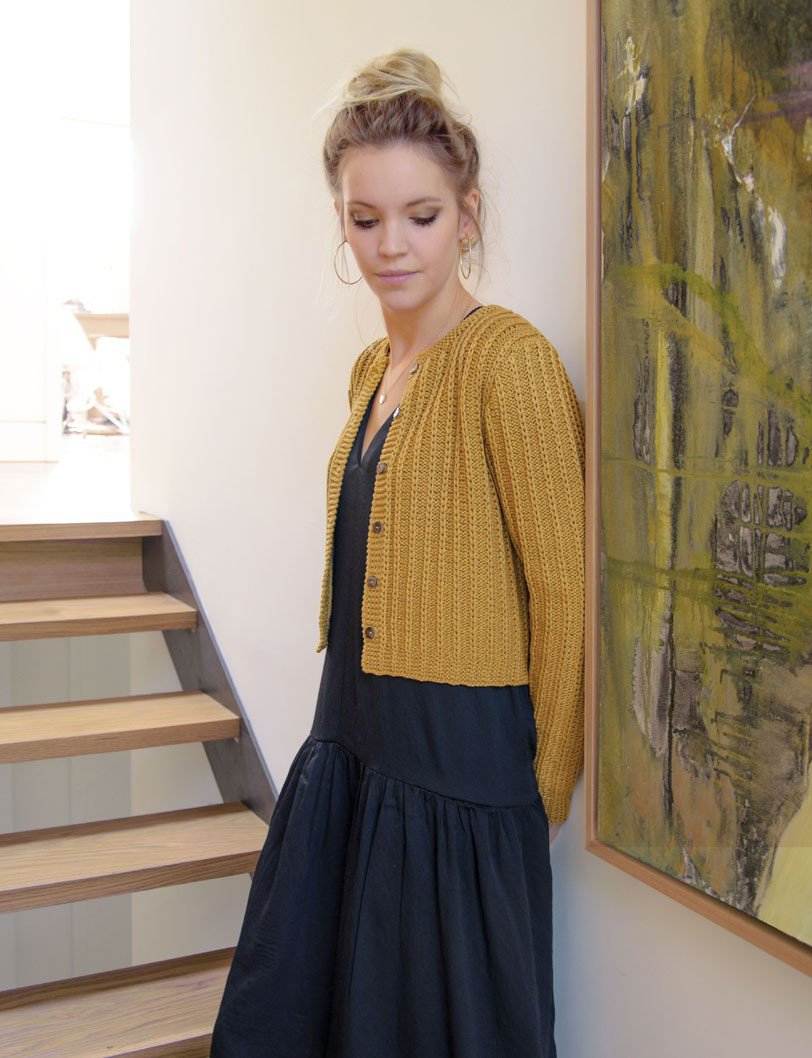 - Желтый. Солнечный желтый цвет способствует подъему настроения. Модели бледно-лимонного или горчичного цвета в сочетании с серым допустимы и в офисных луках. А яркий желтый кардиган украсит летний наряд.