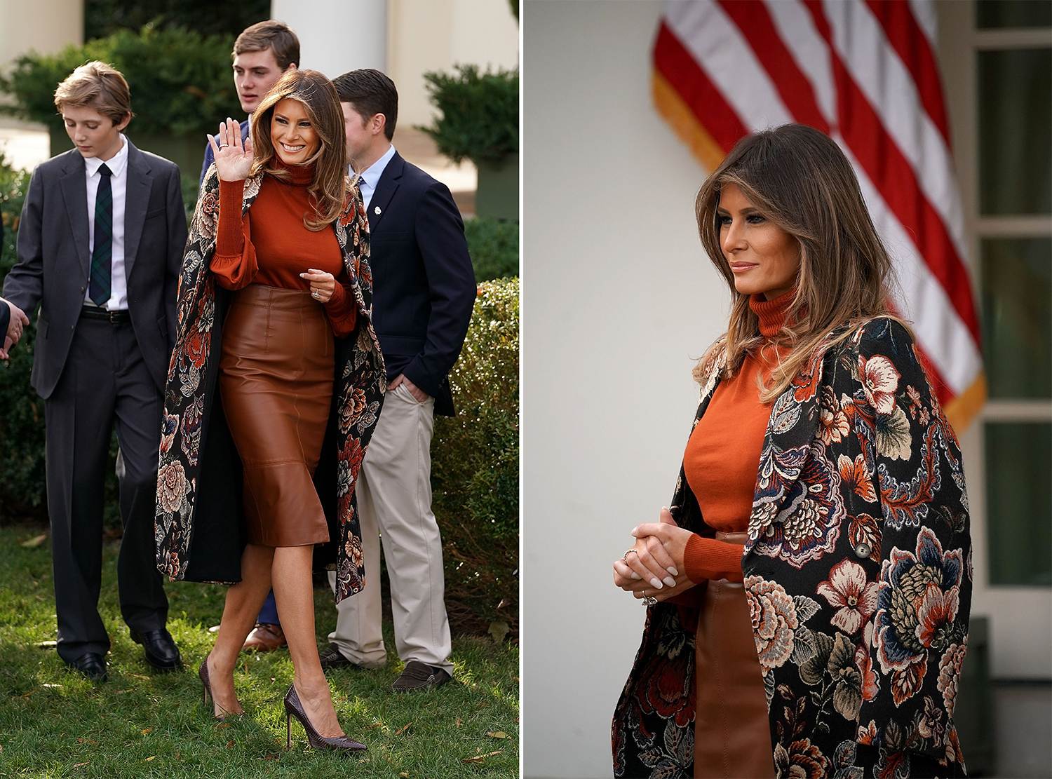 Популярная несколько сезонов назад юбка с высокой талией все не утратила актуальности. Мелания Трамп часто попадает в объективы фотокамер в кожаной юбке с высокой талией в тандеме с бадлоном.
