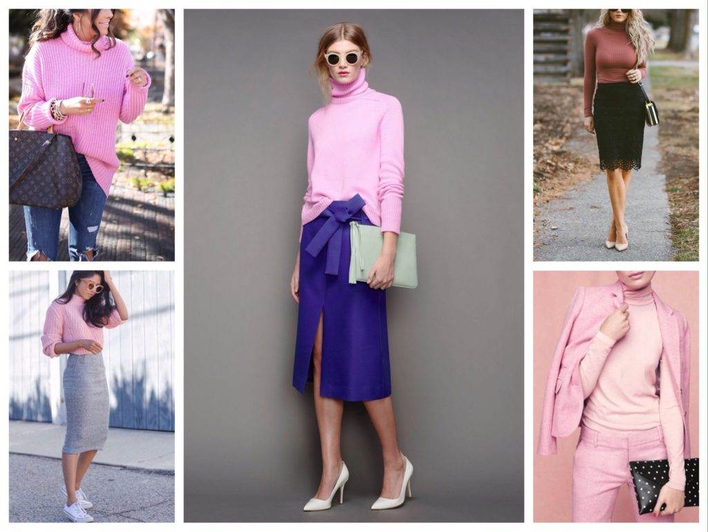 Водолазка может быть одноцветной или украшенной ярким принтом, узором. Светлые модели можно комбинировать с темным низом и пиджаком, а темные, наоборот, красиво смотрятся с контрастной по цвету одеждой.