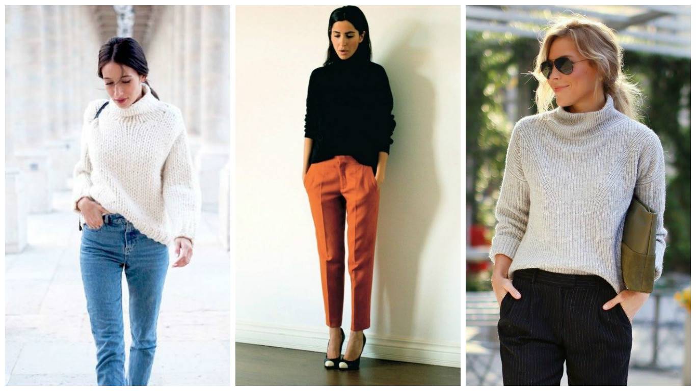 Тут можно выбирать абсолютно любые модели штанов: классические, скинни или расклешенные. Главное, чтобы они были безупречны по фигуре. И уже дополняем их водолазкой, заправленной вовнутрь. Можно украсить образ кожаным ремнем под цвет обуви.